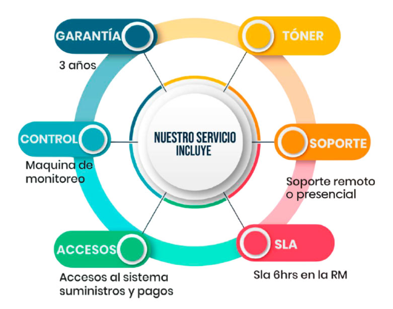 Usted recibe una impresora multifuncional acorde a sus necesidades y todos los insumos necesarios, asegurando así una disponibilidad permanente de consumibles y apoyo técnico